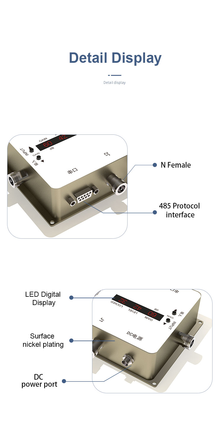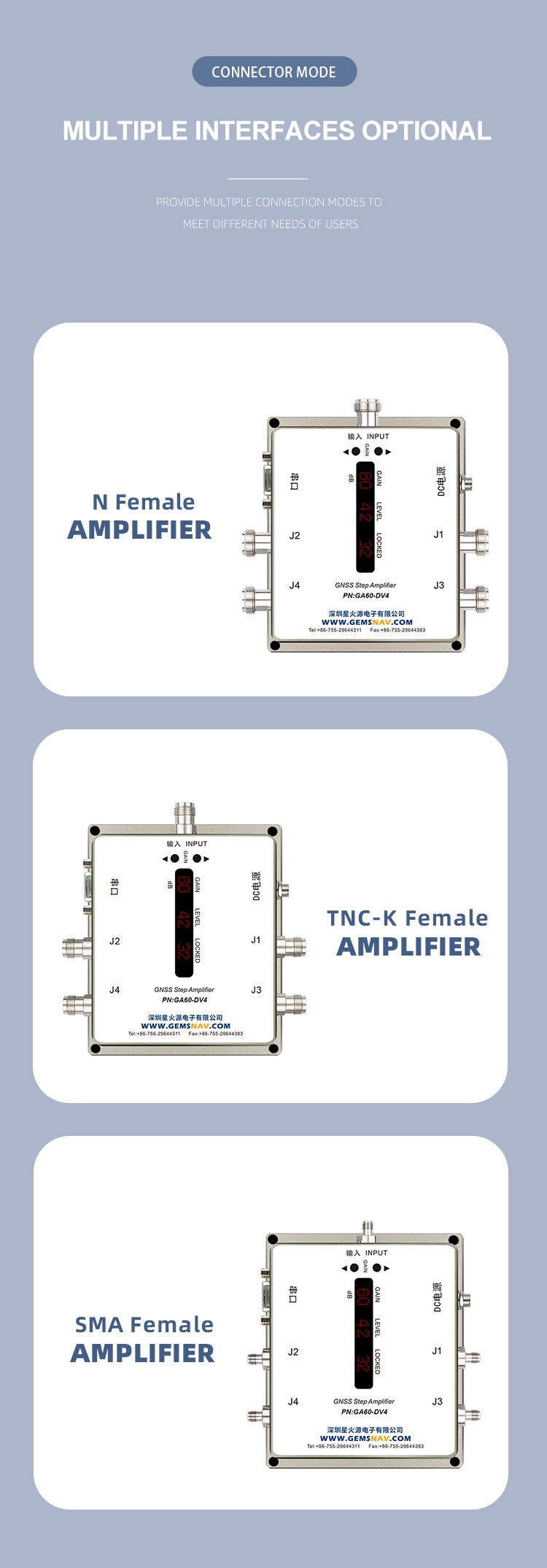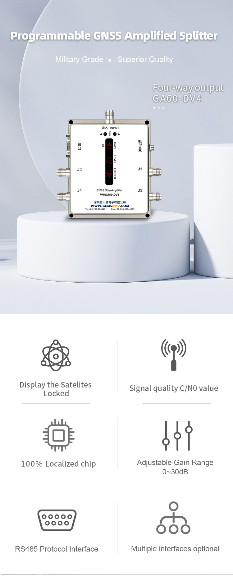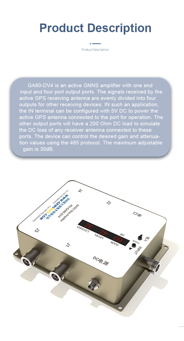 GA60-DV4 is an active GNNS amplifier with one end input and four port output ports. The signals received by the active GPS receiving antenna are evenly divided into four outputs for other receiving devices. IN such an application, the IN terminal can be configured with 5V DC to power the active GPS antenna connected to the port for operation. The other output ports will have a 200 Ohm DC load to simulate the DC loss of any receiver antenna connected to these ports. The device can control the desired gain and attenuation values using the 485 protocol. The maximum adjustable gain is 30dB.